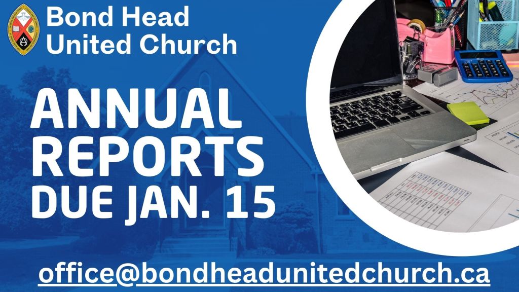 Posted on January 2, 2026 by BHUC AdminAnnual Reports Due Jan. 15 Please submit all Annual Reports to the office at office@bondheadunitedchurch.ca by January 15th. Share this: Click to share on X (Opens in new window) X Click to share on Facebook (Opens in new window) Facebook Like Loading... Related