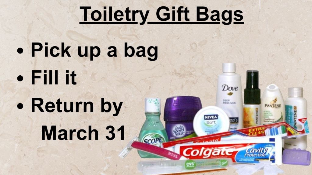 During the Month of March we would like to fill personal toiletry gift bags for My Sister’s Place (Women’s Shelter), S.H.I.F.T and Wow Living (Centres for vulnerable children, adults and seniors); Shampoo, or 2 in 1 shampoo and conditioner, bars of soap, washcloths, toothpaste, toothbrushes, combs, men’s and women’s deodorant, shaving cream, disposable razors, and feminine hygiene products are recommended. Pick up a toiletry bag at the church and fill it with items for male or female use. Please return your filled bag by March 31st. Your outreach support of these projects is gratefully appreciated.