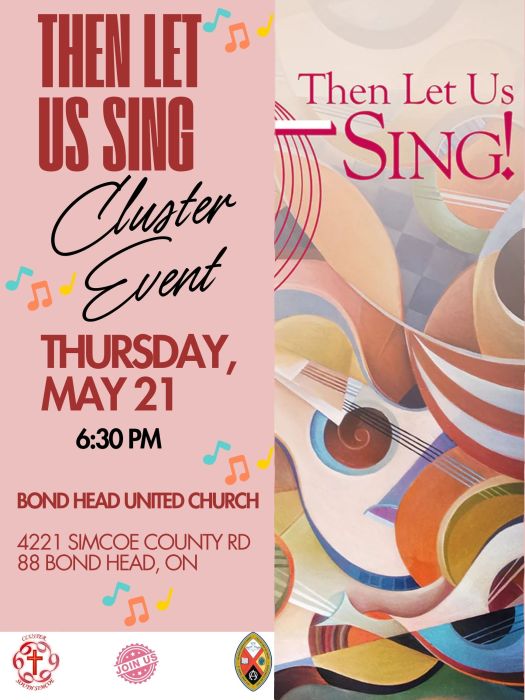 Please join us for a night of song! Cluster South Simcoe will be hosting the event at Bond Head United Church on Thursday, May 21st at 6:30 PM. We will be learning music from the new hymn book, “Then Let Us Sing!” One of the contributors is our very own, Sarah Lough. We look forward to making some joyful noise with you. Hope you can make it!