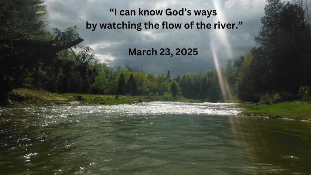The power of the river as it swept by me was an inspiration. I love following a raging river in the spring, listening to the sound it makes and watching the patterns swirling in the water as it tumbles over rocks and dips into gullies. I was reminded of a sermon The Right Reverend Peter Short, Moderator of the United Church preached at the celebration of the Church’s 85th Anniversary in Halifax in 2005. He spoke of God as wild and untameable, like the wind that rushes over the fields, or a river that carves its own path. We cannot know where God is going. God’s ways are not our ways.