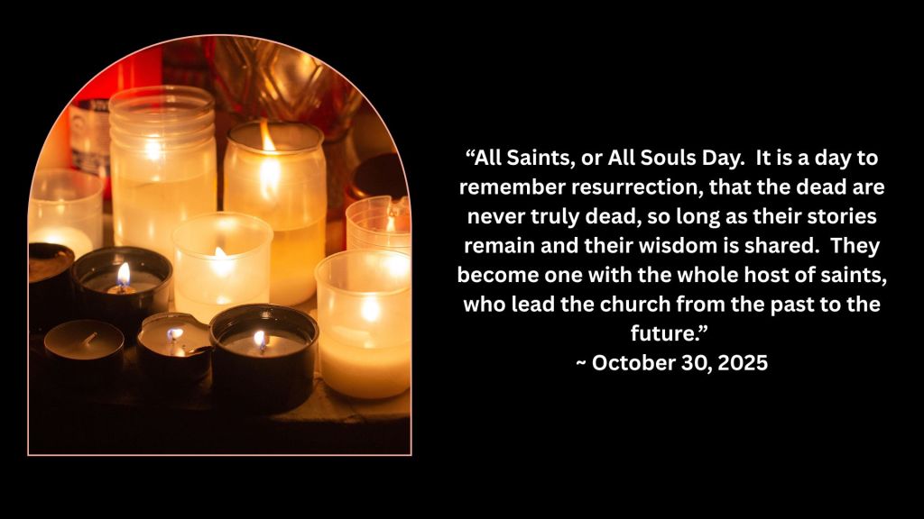 The Christian Church countered this pagan tradition with the creation of All Saints, or All Souls Day. It is a day to remember resurrection, that the dead are never truly dead, so long as their stories remain and their wisdom is shared. They become one with the whole host of saints, who lead the church from the past to the future.