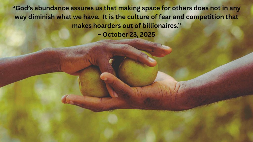 God’s abundance assures us that making space for others does not in any way diminish what we have. It is the culture of fear and competition that makes hoarders out of billionaires.