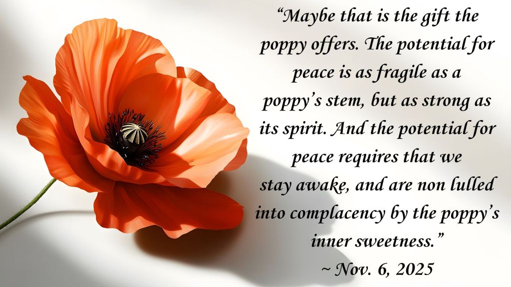 Maybe that is the gift the poppy offers. The potential for peace is as fragile as a poppy’s stem, but as strong as its spirit. And the potential for peace requires that we stay awake, and are non lulled into complacency by the poppy’s inner sweetness.