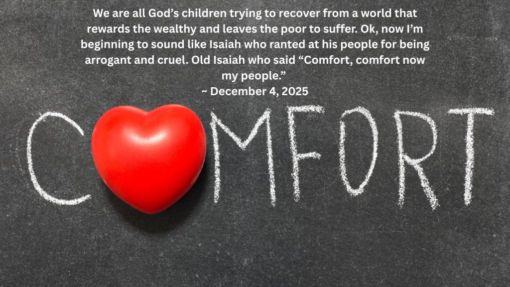 I was out for my morning walk, listening to the news as I breathed in the fresh morning air, when I heard a recording of Donald Trump talking about Somalia. The people who escaped famine and war in Somalia. The people who still live there. I’ve heard some pretty incredulous things, but his words made me feel physically sick. Worst yet was the certain knowledge that those despicable words give license to some people to do violence to anyone who might look like they come from Somalia. I don’t generally comment on US politics here in the Chit Chat, but since our theme for Advent is “what are we waiting for”, I thought I ought to heed my own words. Why are we waiting to understand we are all God’s people? Why are we waiting for a hero to jump in and fix all the problems? Why are we waiting for someone to do something about people in power who exhibit, and encourage such hatred? So what can I do, small as I am? Well, first of all I going to learn about Somalia and why they are the third poorest country in the world – by the way, it’s not because of the people of Somalia, but colonial British rule and subsequently being divided up as spoils by European countries and rich sultans. And then I’m going to learn about its people, so I can wipe away any judgement I might harbour about them. And then, I’m going to speak the truth to people who might think those who migrate to our country are somehow a problem. All God’s children, remember? We are all God’s children trying to recover from a world that rewards the wealthy and leaves the poor to suffer. Ok, now I’m beginning to sound like Isaiah who ranted at his people for being arrogant and cruel. Old Isaiah who said “Comfort, comfort now my people.”